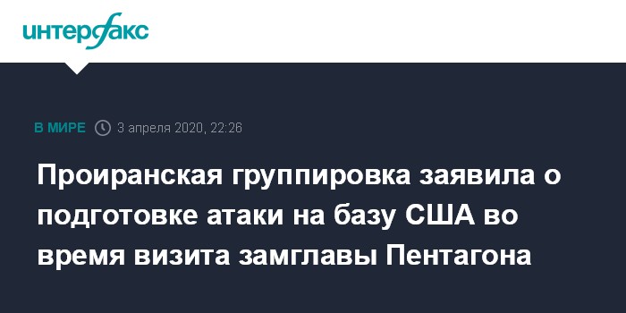 Москва. 3 апреля. INTERFAX.RU - Поддерживаемая Ираном иракская группировка "Асбат аль-Тайран" выступила с утверждением, что она собиралась атаковать базу "Айн аль-Асад" в Ираке, когда на ней находились замглавы Минобороны США и еще ряд американских официальных лиц, сообщил в пятницу портал Al-Masdar и иранский телеканал Press TV.