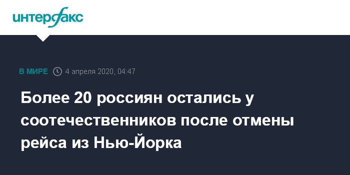 Москва. 4 апреля. INTERFAX.RU - Российские соотечественники на настоящий момент предложили разместить у себя порядка 20 человек, которые не смогли вернуться в Россию из-за отмены рейса Нью-Йорк-Москва авиакомпании "Аэрофлот", сообщили "Интерфаксу" в Генконсульстве РФ в Нью-Йорке.