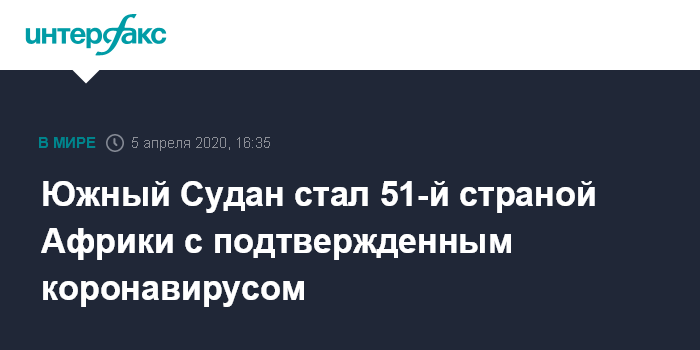 Москва. 5 апреля. INTERFAX.RU - В Южном Судане выявили первый случай COVID-19. Это 51-я из 54 стран Африки, где есть заболевшие коронавирусом, сообщает агентство Associated Press.