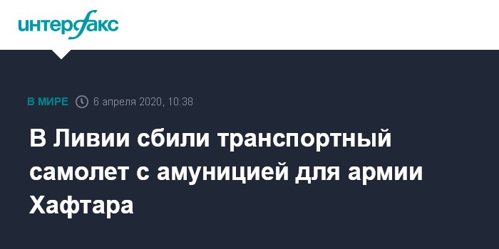 Москва. 6 апреля. INTERFAX.RU - Силы правительства национального согласия Ливии (ПНС), признанного ООН, накануне сбили транспортный самолет с грузом амуниции для бойцов маршала Халифы Хафтара. Об этом сообщило в понедельник агентство "Анадолу" со ссылкой на представителя войск ПНС.