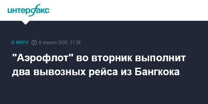Москва. 6 апреля. INTERFAX.RU - "Аэрофлот" 7 апреля выполнит два специальных рейса для возвращения российских граждан из Бангкока, говорится в сообщении компании.