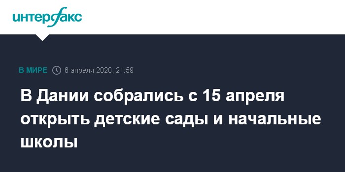 Москва. 6 апреля. INTERFAX.RU - Премьер-министр Дании Метте Фредриксен объявила, что детские сады и начальные школы в стране могут возобновить работу 15 апреля, сообщают европейские СМИ.
