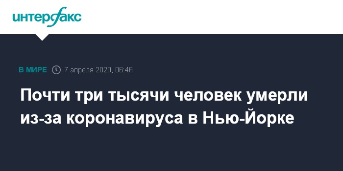 Москва. 7 апреля. INTERFAX.RU - Количество случаев заражения коронавирусом в городе Нью-Йорке приближается к 70 тысячам, число смертей почти достигло 3 тысяч, сообщается на сайте мэрии.