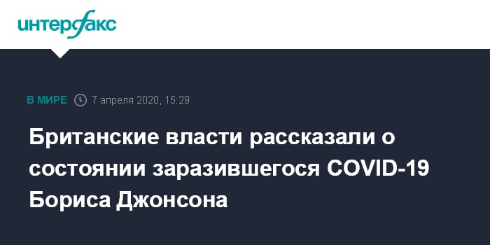 Накануне, 6 апреля, вечером стало известно, что состояние британского премьера, заболевшего коронавирусом, ухудшилось. Тогда сообщалось, что его перевели в отделение интенсивной терапии.