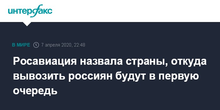 Москва. 7 апреля. INTERFAX.RU - Вывозные рейсы с россиянами в ближайшие дни планируется сформировать из Таиланда, Индии, Японии, Кипра, Испании, Турции, Черногории, также отмечена необходимость скорейшего вывоза россиян из Южной Кореи и Италии, сообщили "Интерфаксу" в Росавиации.