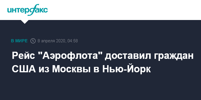 Москва. 8 апреля. INTERFAX.RU - Самолет Boeing 777-300 "Аэрофлота" с американскими гражданами приземлился в международном аэропорту имени Джона Кеннеди (JFK) в Нью-Йорке, сообщает сайт аэропорта.