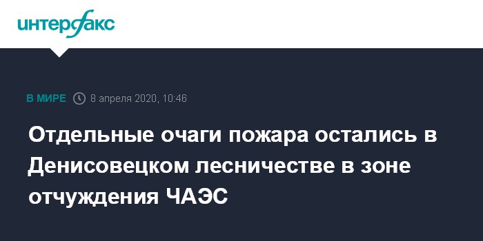 Москва. 8 апреля. INTERFAX.RU - В зоне отчуждения Чернобыльской АЭС на территории Котовского лесничеств открытого огня нет, в Денисовецком лесничестве горит трава и кустарник, сообщает в среду Государственная служба по чрезвычайным ситуациям Украины.
