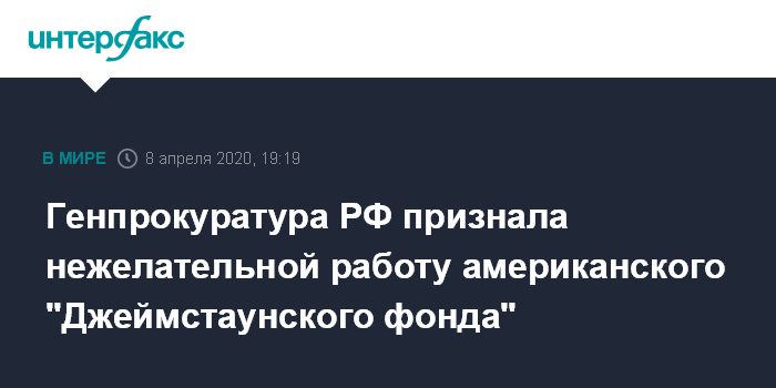 Москва. 8 апреля. INTERFAX.RU - Генпрокуратура РФ признала нежелательной на территории России деятельность американского неправительственной фонда The Jamestown foundation.