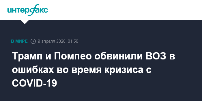 Москва. 9 апреля. INTERFAX.RU - Президент США Дональд Трамп и глава Госдепа Майк Помпео в четверг обвинили ВОЗ в ошибках во время кризиса вокруг коронавируса COVID-19.