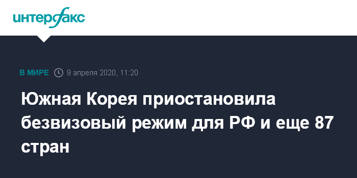 Москва. 9 апреля. INTERFAX.RU - Южная Корея временно приостановит безвизовый режим для граждан государств, запретивших въезд для южнокорейцев, сообщил премьер страны Чон Се Гун.