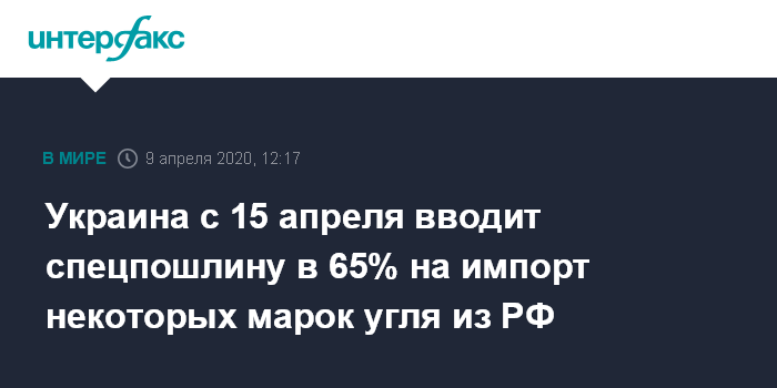 Москва. 9 апреля. INTERFAX.RU - Специальная пошлина в размере 65% на импорт из Российской Федерации угля с рядом исключений вводится на Украине с 15 апреля, свидетельствует обнародованное постановление украинского правительства.