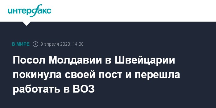 Москва. 9 апреля. INTERFAX.RU - В разгар пандемии коронавируса Посол Молдавии в Швейцарии покинула своей пост и перешла работать в ВОЗ. Об этом пишут в четверг молдавские СМИ.