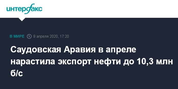Москва. 9 апреля. INTERFAX.RU - Саудовская Аравия в апреле увеличила экспорт нефти до 10,3 млн баррелей в сутки, сообщает Bloomberg со ссылкой на данные системы отслеживания танкеров. На прошлой неделе экспорт нефти Саудовской Аравии достиг 10 млн б/с, а к утру 9 апреля он составлял уже 10,296 млн б/с.