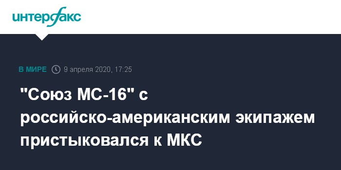Москва. 9 апреля. INTERFAX.RU - Транспортный пилотируемый корабль "Союз МС-16" с российско-американским экипажем пристыковался к Международной космической станции (МКС) в автоматическом режиме, трансляцию полета ведет "Роскосмос".