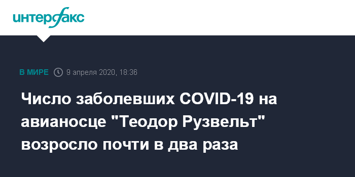 Москва. 9 апреля. INTERFAX.RU - По меньшей мере, 416 моряков команды американского атомного авианосца "Теодор Рузвельт" заболели коронавирусом. Об этом сообщает в четверг телеканал CNN со ссылкой на источник в ВМС США.