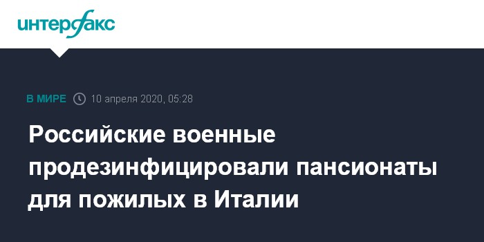 "Всего российскими военными врачами-эпидемиологами и специалистами войск радиационной химической и биологической защиты (РХБЗ) Минобороны России совместно с итальянскими военными специалистами проведена полная дезинфекция пансионатов для пожилых людей в 43 населенных пунктах Ломбардии", - сказано в сообщении, поступившем в "Интерфакс" в пятницу.