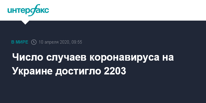 Москва. 10 апреля. INTERFAX.RU - По состоянию на 9 утра пятницы на Украине подтверждены 2203 случая заболевания COVID-19, сообщает Центр общественного здоровья Министерства здравоохранения Украины (ЦОЗ).