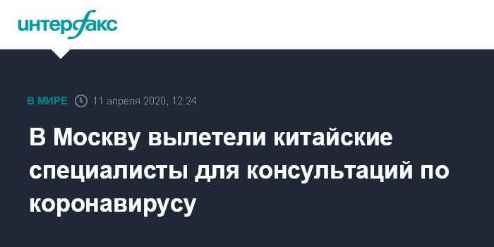 Москва. 11 апреля. INTERFAX.RU - Группа китайских специалистов вылетела в Москву для оказания поддержки в борьбе с коронавирусом, сообщает генеральное консульство России в Харбине.
