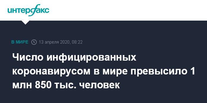 Москва. 13 апреля. INTERFAX.RU - В мире по состоянию на 8:00 по московскому времени понедельника зафиксировано 1 млн 850 тыс. 527 подтвержденных случаев заражения коронавирусом COVID-19, число жертв достигло 114 тыс. 245, сообщил американский университет Джонса Хопкинса, который осуществляет мониторинг положения дел с распространением инфекции.