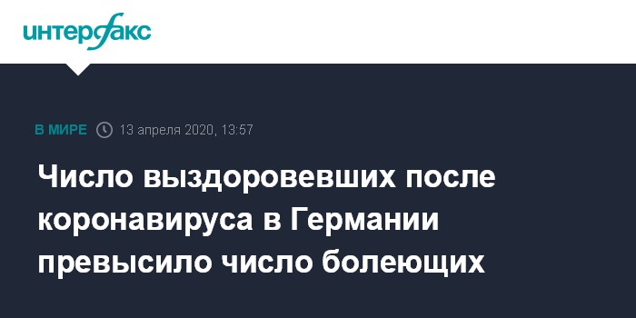 Москва. 13 апреля. INTERFAX.RU - Число выздоровевших после коронавируса в Германии в понедельник превысило число болеющих.