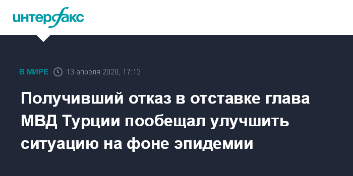 Москва. 13 апреля. INTERFAX.RU - Глава МВД Турции Сулейман Сойлу, которому ранее отказал в отставке турецкий президент Реджеп Тайип Эрдоган, в понедельник пообещал приложить силы для исправления положения, сложившегося в стране в связи с эпидемией коронавируса.