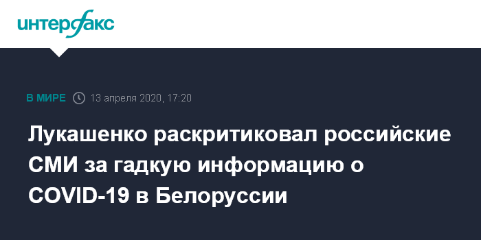 Москва. 13 апреля. INTERFAX.RU - Президент Белоруссии Александр Лукашенко заявил, что российские СМИ предвзято освещают принимаемые в республике меры по борьбе с коронавирусом.
