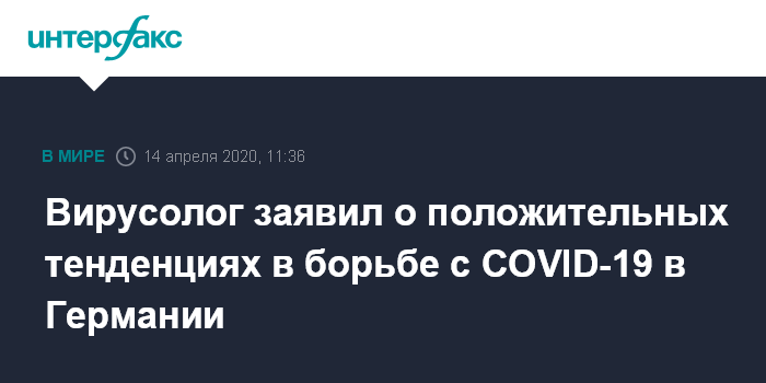 Москва. 14 апреля. INTERFAX.RU - Институт Роберта Коха, занимающийся изучением инфекционных заболеваний, фиксирует положительную динамику в преодолении эпидемии COVID-19 в Германии, но четкого указания на то, что число зараженных снижается, по-прежнему нет, сообщил во вторник глава научного учреждения Лотар Вилер.