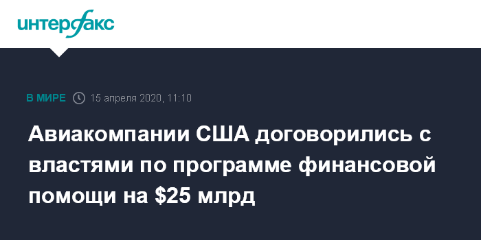 Москва. 15 апреля. INTERFAX.RU - Американские авиаперевозчики предварительно договорились с Минфином об условиях предоставления им финансовой помощи в размере $25 млрд в связи с кризисом, начавшимся из-за пандемии, пишет Bloomberg. Как заявил глава ведомства Стивен Мнучин, в программе согласились участвовать ряд крупных компаний.