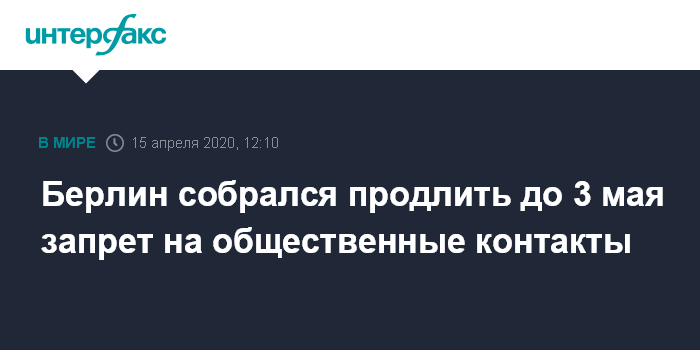 Москва. 15 апреля. INTERFAX.RU - Берлин хочет продлить запрет на общественные контакты, введенный из-за пандемии коронавируса, до 3 мая, пишет в среду агентство DPA.