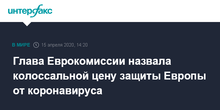 Москва. 15 апреля. INTERFAX.RU - Принятые в ЕС ограничительные меры помогли защитить население от коронавируса COVID-19, однако за это пришлось заплатить колоссальную цену, заявила председатель Еврокомиссии (ЕК) Урсула фон дер Ляйен.