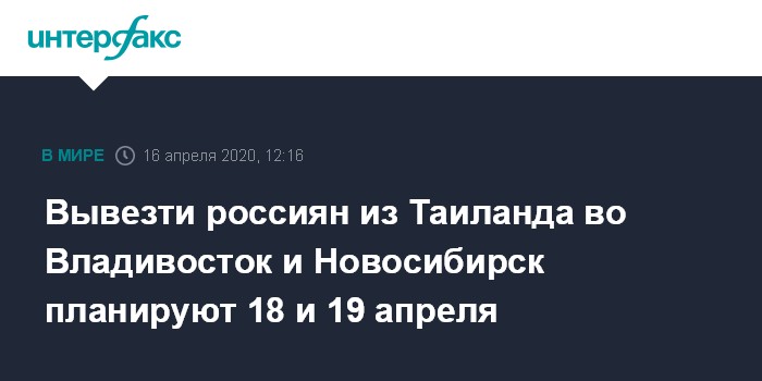 Москва. 16 апреля. INTERFAX.RU - Посольство России в Бангкоке сообщило, что на 18 и 19 апреля предварительно запланированы три для вывоза россиян во Владивосток, Екатеринбург и Новосибирск.