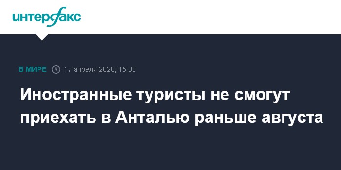 Москва. 17 апреля. INTERFAX.RU - Самая популярная у туристов провинция Турции не сможет начать прием иностранных гостей раньше августа, поскольку авиакомпании не готовы к возобновлению полетов до этого месяца, сообщает турецкая газета Haberler.