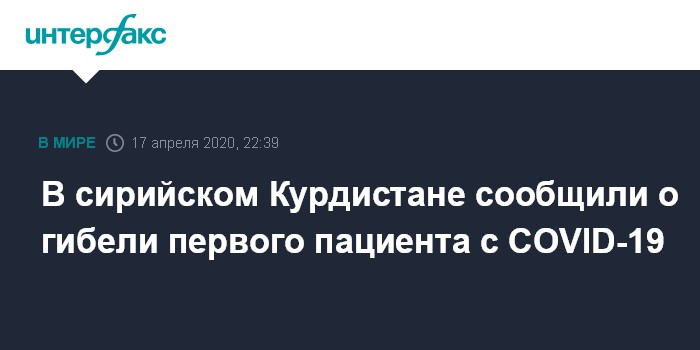 Москва. 17 апреля. INTERFAX.RU - В администрации сирийского Курдистана подтвердили в пятницу первый в регионе летальный исход вследствие заражения COVID-19, сообщает медиа-группа Rudaw Media Network.