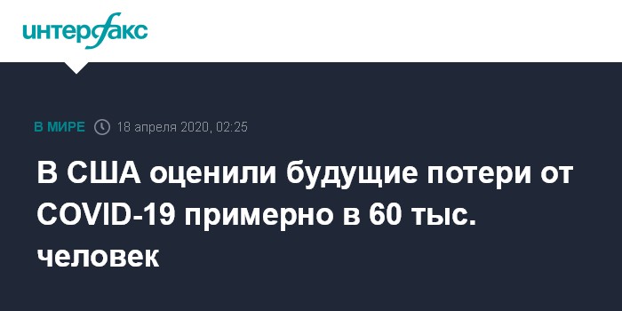 Москва. 18 апреля. INTERFAX.RU - Президент США Дональд Трамп заявил, что по последним расчетам жертвами коронавируса COVID-19 в его стране могут стать более 60 тыс. жителей страны.