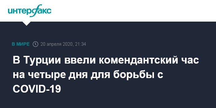 Москва. 20 апреля. INTERFAX.RU - Президент Турции Реджеп Тайип Эрдоган объявил о введении комендантского часа в 31 провинции страны на четыре дня, чтобы остановить распространение коронавируса, пишут в понедельник турецкие СМИ.