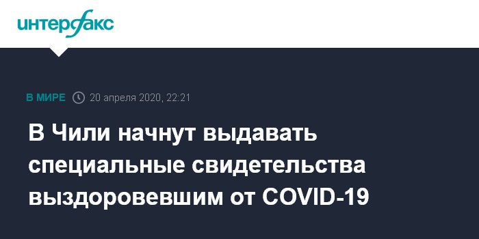 Москва. 20 апреля. INTERFAX.RU - Власти Чили запустили программу по выдаче сертификатов выздоровевшим от коронавируса, сообщает телеканал CNN.