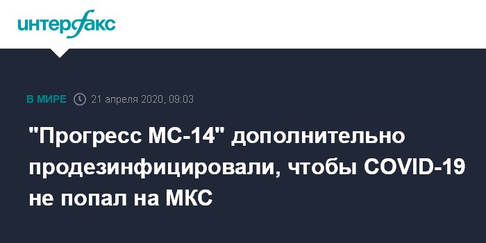 Москва. 21 апреля. INTERFAX.RU - Для предотвращения попадания на Международную космическую станцию (МКС) коронавируса корабль "Прогресс МС-14", отправляющийся к станции 25 апреля, был дополнительно продезинфицирован, сообщили "Интерфаксу" в ракетно-космической корпорации "Энергия".