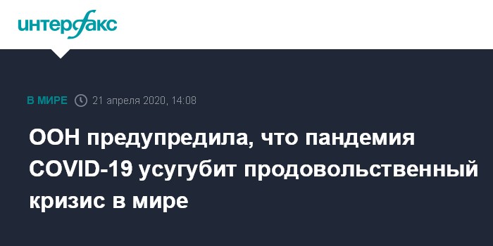 В апреле главы сразу нескольких международных организаций предупредили, что ситуация вокруг COVID-19 грозит перебоями с поставками продовольствия в мире при отсутствии надлежащих мер властей. С такими предупреждениями выступили глава Всемирной организации здравоохранения (ВОЗ) Тедрос Адханом Гебрейесус, гендиректор Всемирной торговой организации (ВТО) Роберту Азеведу и глава ФАО Цюй Дунъюй.