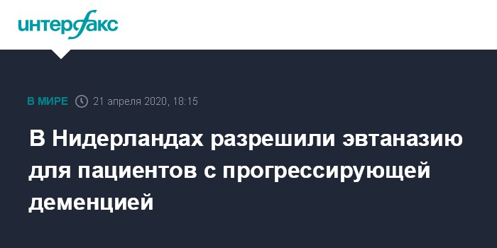 Москва. 21 апреля. INTERFAX.RU - Верховный суд Нидерландов во вторник вынес решение, дающее врачам право проводить эвтаназию при прогрессирующей деменции у пациента.