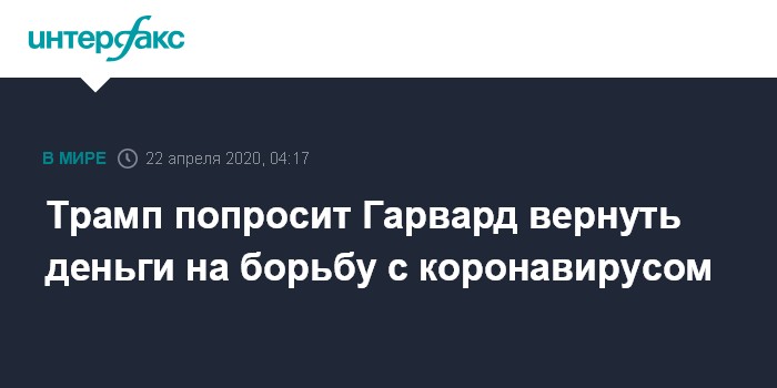 Москва. 22 апреля. INTERFAX.RU - Президент США Дональд Трамп заявил во вторник, что он собирается попросить крупные предприятия и учреждения, такие как Гарвардский университет, вернуть деньги, которые они получили в рамках пакета помощи по коронавирусу.
