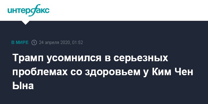 Москва. 24 апреля. INTERFAX.RU - Президент США Дональд Трамп считает неверными сообщения СМИ о том, что у лидера КНДР Ким Чены Ына очень серьёзные проблемы со здоровьем.