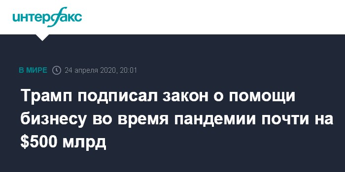 Москва. 24 апреля. INTERFAX.RU - Президент США Дональд Трамп в пятницу одобрил законопроект о пакете финансовой помощи для борьбы с коронавирусом и его последствиями почти на $500 млрд, сообщает NBC News.