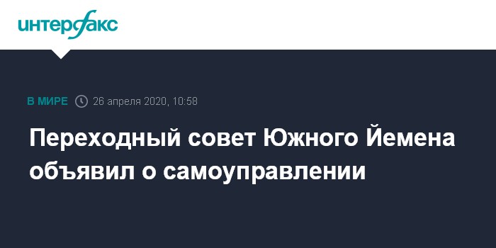 Москва. 26 апреля. INTERFAX.RU - Переходный совет Южного Йемена, сформированный сепаратистами, объявил о режиме самоуправления на юге страны и ввел режим чрезвычайного положения, сообщает в воскресенье агентство Associated Press.