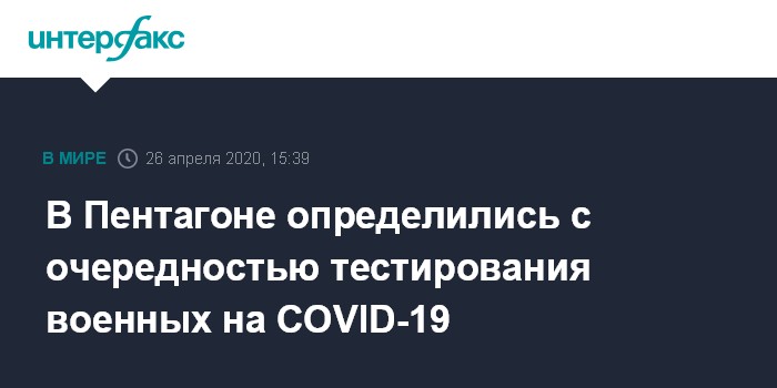 Москва. 26 апреля. INTERFAX.RU - Пентагон пока не может систематически тестировать на коронавирус всех военнослужащих, поэтому концентрируется на ключевых направлениях, сообщает Associated Press.