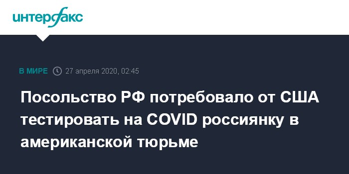 Москва. 27 апреля. INTERFAX.RU - Посольство РФ в Вашингтоне потребовало от американских властей безотлагательно провести тестирование на коронавирус у находящейся в тюрьме в США россиянки Богданы Осиповой и оказать ей необходимую медицинскую помощь, заявил посол России в США Анатолий Антонов.