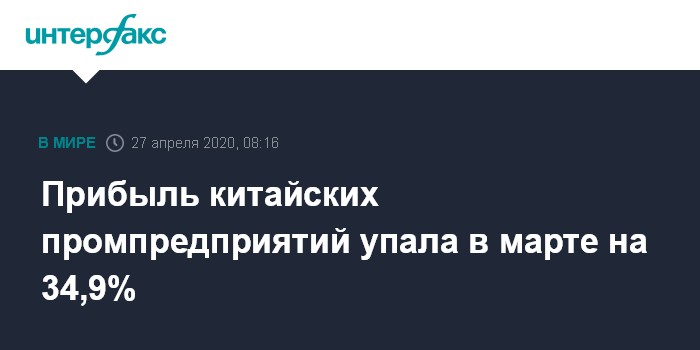 Москва. 27 апреля. INTERFAX.RU - В марте 2020 года прибыль китайских государственных промышленных предприятий сократилась в годовом измерении на 34,9%, достигнув 370,66 млрд юаней ($52,43 млрд), сообщило Государственное статистическое управление (ГСУ) КНР.