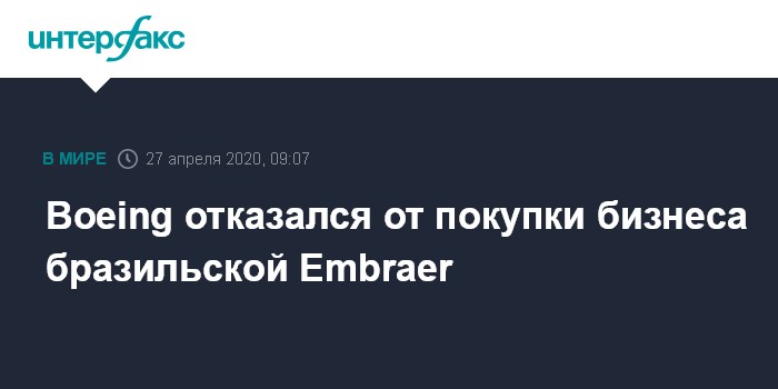 Москва. 27 апреля. INTERFAX.RU - Авиастроительная корпорация Boeing передумала покупать бизнес бразильского конкурента Embraer, что позволит ей сэкономить $4,2 млрд. Boeing сообщил, что они не сумели в срок до 24 апреля договориться об условиях сделки, и концерн воспользовался правом разорвать соглашение.