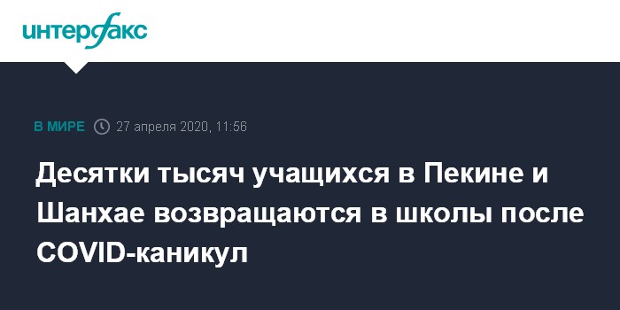 Москва. 27 апреля. INTERFAX.RU - Десятки тысяч учащихся в Пекине и Шанхае в понедельник отправляются в школы после перерыва в несколько месяцев из-за коронавируса, сообщают китайские СМИ.