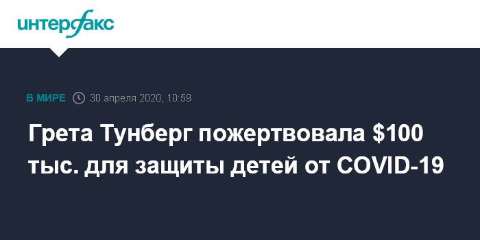 Москва. 30 апреля. INTERFAX.RU - Шведская экоактивистка Грета Тунберг выделила ЮНИСЕФ (Детскому фонду ООН) $100 тысяч для помощи и защиты детей от коронавируса COVID-19, сообщают европейские СМИ.