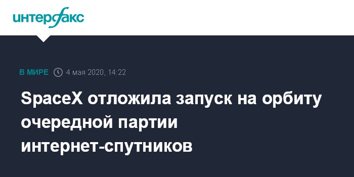 Москва. 4 мая. INTERFAX.RU - Американская компания SpaceX отменила запланированный на 7 мая запуск на орбиту очередной партии из 60 мини-спутников для продолжения развертывания глобальной сети интернет-покрытия системы Starlink, сообщил сайт Spaceflight Now.